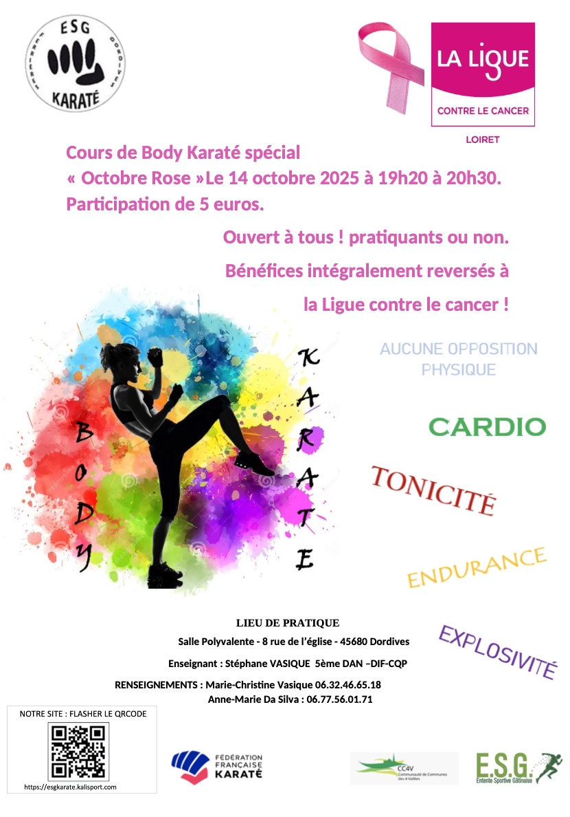 ESG Karaté défense spécial 'Octobre Rose' le 09 octobre salle polyvalente de Dordives. Cliquez sur l'article dans Fil évènementiel pour davantage d'information